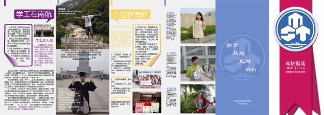 该指南以“相约南航,共同成长“为主题,分为“学习在南航、三创在南航、学工在南航、公益在南航”四大模块。这四大模块也是学生大学发展的四大主要路径。它们分别向新生解释了大学学习、科技创新、学生工作、志愿服务究竟是什么,怎么做的问题。同时针对每一个模块,《成”材”指南》列举了2-3个学院中最具代表性的学生:有大学成就奖获得者朱雅亮、第九届“中国青少年科技创新”奖获得者申来法、在最基层的班长工作中带领班级获得省级优秀班级称号的学生骨干钱伟,还有我校唯一的江苏省十佳志愿者陈羽等。