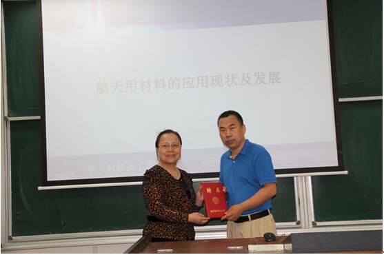 为《航空航天材料进展》课程授课的行业教师分别来自中航商用航空发动机有限责任公司、中国商飞上海飞机设计研究院、中利腾晖光伏科技有限公司、航天材料及工艺研究所、中航工业西安航空发动机(集团)有限公司(430厂)。前5讲授课题目分别为《商用发动机材料工艺概述》、《先进复合材料在民用飞机上的应用》、《太阳能发电技术》、《航天用材料的应用现状及发展》、《热处理技术与中国航空发动机制造》。授课教师为此精心准备,授课效果非常好,与学生互动频繁,气氛热烈。梁院长还为各位授课教师颁发了“行业教师”聘书。