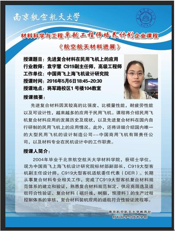 《航空航天材料进展》是材料科学与工程“卓越工程师培养计划”继上学期《材料工程专题》后的又一门从企业聘请行业教师进行授课的企业课程,课程从2016年5月5日开始,于2016年6月1日圆满结课,共6讲,聘请了5位行业教师,最后一节课为总结座谈会。