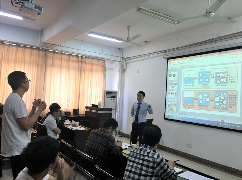 在本次报告中,孙国星教授先用生动、幽默的话语介绍了其学生时代至于澳门大学任职的奋斗历史,随后对澳门大学的建立与发展进行了简要描述。之后详细讲解了其主要研究方向——纳米复合水凝胶的制备工艺及市场发展。通过使用低温处理的水泥制备出的粒径<5nm的氢氧化钙晶体(CNS)与超弹性水凝胶复合,制备出低添加量(40-200ppm)、透明度高、回复能力好、伸长率与压缩强度优异的水泥基纳米复合泡沫材料,其性能远高于当前市面所产水泥基材料,在世界范围内都有着极强的竞争力。关于此项目的拓展工作也正顺利展开,正向着高强、不挥发、导电、耐高低温、细胞载体的研究方向不断拔高。报告会共历时1小时30分钟,孙国星教授幽默的谈吐和通俗易懂的讲解给在场师生留下了深刻的印象。同学们与孙国星教授进行了充分的交流与讨论,场面气氛热烈。