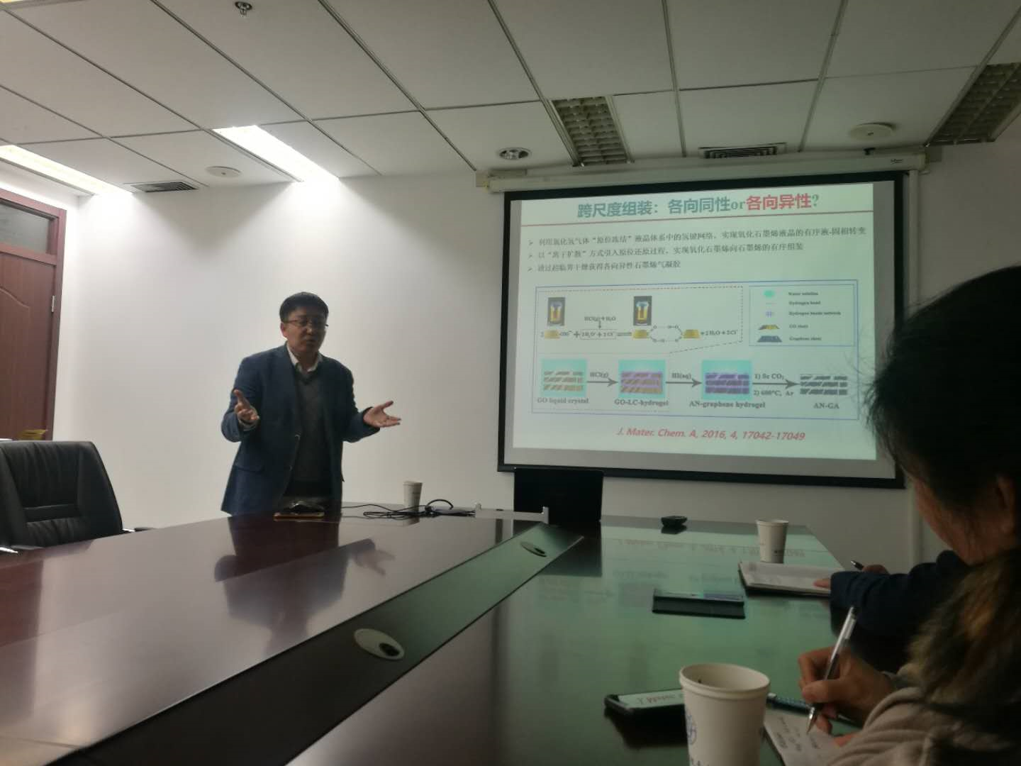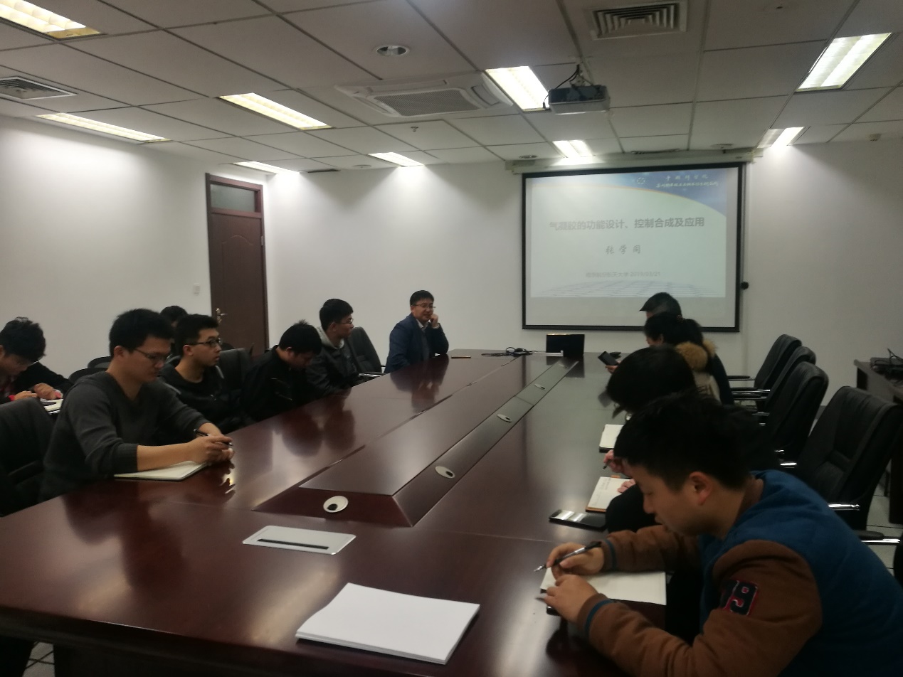 张研究员详细介绍了气凝胶材料的相关背景、新型气凝胶发展和制备技术现状,及目前面临的技术问题和科学问题,主要研究领域集中在低维纳米结构凝胶化控制组装方面的研究,从事气凝胶材料的结构设计、合成及应用研究。同时,张研究员向现场师生展示了他们团队目前主要研究的氮化硼气凝胶、石墨烯气凝胶、聚吡咯/银纳米复合气凝胶等研究成果,为师生们就新型气凝胶未来研究的发展方向提供更多的研究思路和方法。