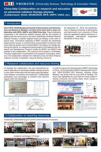 午夜av 汤晓斌教授课题组从2015年起与意大利国家核物理研究院、意大利帕维亚大学开展科学研究、人才培养方面的国际合作。2016年,联合意大利合作单位申报获批了国家重点研发计划政府间国际科技创新合作重点专项——加速器硼中子俘获癌症治疗超热中子束设计与剂量优化。该项目多次得到中意两国外交、科技部门的关注,寄希望该项目成果能成为“一带一路”计划中意合作的实质性标志成果。由午夜av 牵头,2018年12月我校与意大利帕维亚大学签署了校际合作框架协议;2019年10月又签署了两校共同成立“先进放射治疗物理国际合作联合实验室”协议。截止到今年下半年,中意双方互派本科生、硕士生和博士生交流联培共20余人次;科研人员联合发表学术论文33篇;共同举办了2018国际硼中子俘获治疗发展论坛;意大利帕维亚大学知名教授来校开设国际暑期课程4门。通过与意大利各科研机构的国际学术交流与合作,有利推动了我校核科学与技术学科的发展,实现了人才培养和科学研究的双赢,期待这些合作成果能成为我校国际化建设的标志性成果。