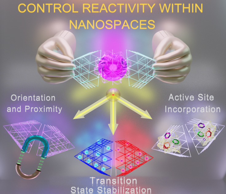 图1. 调控纳米空间化学反应活性的超分子策略:1)底物的邻近性和取向;2)过渡状态稳定;3)催化活性位点引入