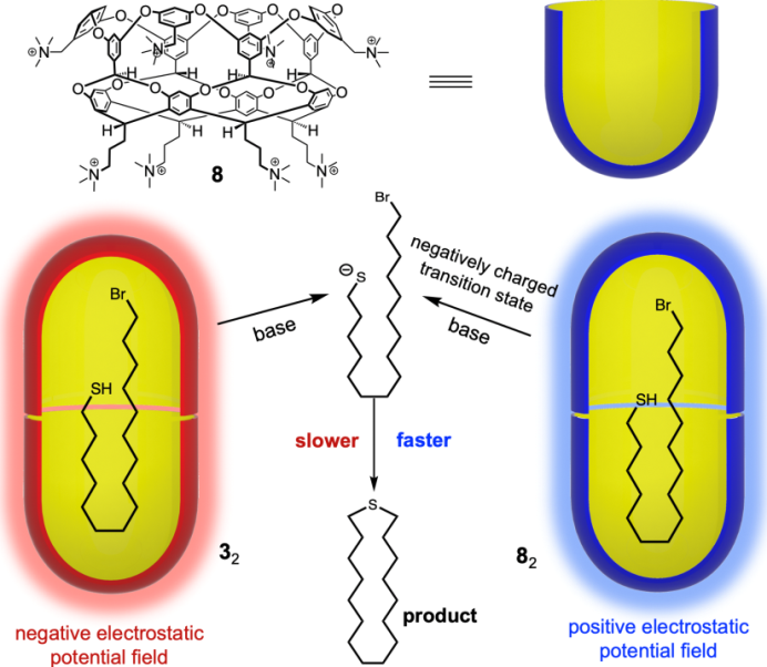 图3. Gibb等通过疏水作用自组装形成的具有相反静电场的超分子纳米胶囊用于催化环化反应。