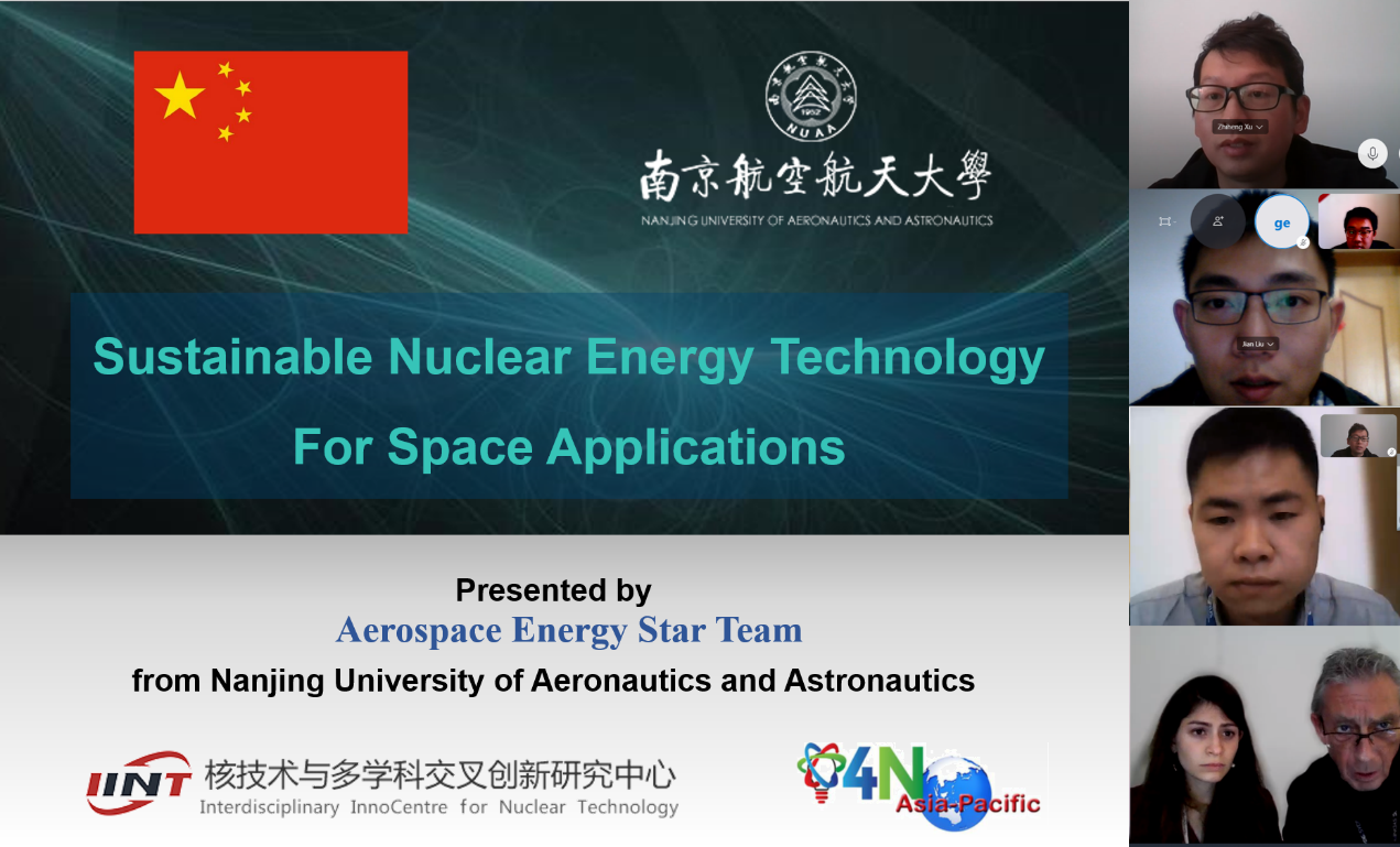 2月初,“Aerospace Energy Star Team”团队收到了3月份在澳大利亚悉尼举办的I4N 2020全球总决赛的参赛邀请,并获得全额差旅资助,但由于COVID-19疫情影响无法前往现场参赛。经过与竞赛组委会的沟通协调,也得到了竞赛组委会的理解和支持,团队最终采取“视频录制、现场播放和线上交流答疑”的方式代表亚太地区参与到了此次I4N 2020全球总决赛中,并与来自其他国家抵达总决赛比赛现场的5支队伍进行了“同台”角逐。虽然“Aerospace Energy Star Team”团队最终没能取得更好的成绩,但值此新冠肺炎疫情期间,南航学子克服困难积极向世界核技术领域专家和科研团队展示自我,在国际化的合作交流中互相学习值得肯定。