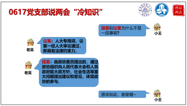 首先,由于支部人数较多,为充分调动每一位成员的学习积极性,确保学习质量,在支部内成立了两会领学小组。小组带头搜集相关信息、整理学习材料、发起讨论议题等。20日晚,小组发布精心自制的《两会知识科普》,从两会的简介、会议形式、代表情况、今年主要看点等方面做了介绍,使支部成员加深对今年这场特殊两会的认识。