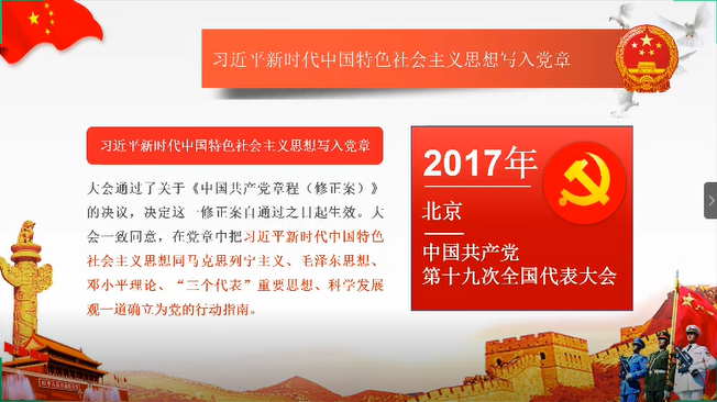 习总书记在庆祝中国人民解放军建军90周年大会上发表重要讲话时指出,在风雨如磐的漫长革命道路上,我军将士讲得最多的一句话是“只要跟党走,一定能胜利”。因此,在活动最后,纪检委员李雨欣带领大家学习十九大对《党章》十项重要修改,详细地阐释了习近平新时代中国特色社会主义思想写入党章的时代背景,解析了“八个明确”和“十四个坚持”的思想核心。带领大家从政治、理论、实践三个角度深化解读党章。