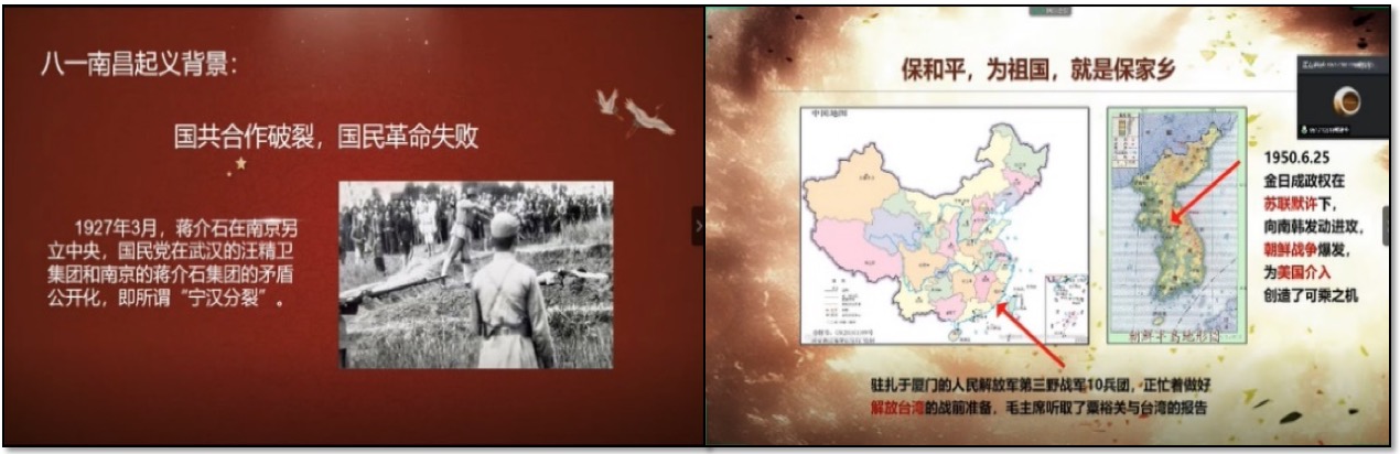 活动开始,小组代表廖紫璇和孙子涵带领大家回顾人民军队的创立、了解政治建军思想的形成。南昌起义“山河统一”的口号彰显着人民军队武装革命的决心,古田会议的决议确定了无产阶级的建军路线,朝鲜战场的胜利为年轻的中国共产主义政权撑直了腰杆。在创业的时间线上,人民军队冲破内在束缚,抗击外部入侵,用生命履行着政治建军的路线。