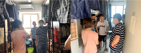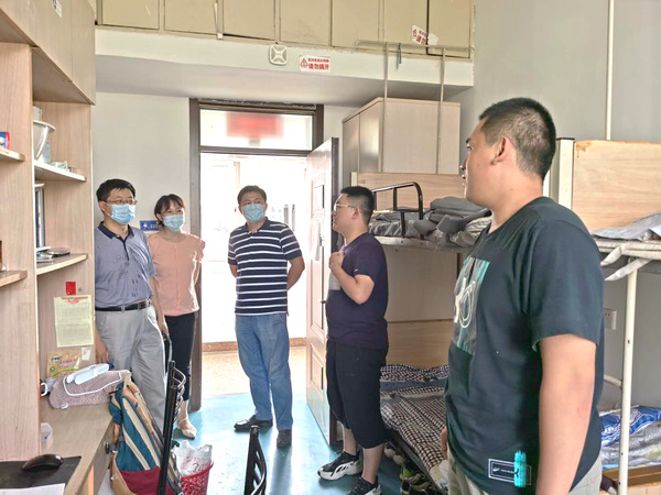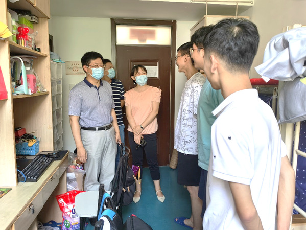 走访过程中,张校刚对舟车劳顿的同学们表示关心,提醒同学们要注意休息,南京天气较热,近日要防止中暑。除此之外,他还关切的询问同学们在返校后是否遇到困难,如果有需要帮助的地方要及时和辅导员反馈,学院定会尽力帮助。看着有的同学还在收拾行李,许赞提醒同学们平时要注意生活环境的消毒和通风,保持宿舍卫生,勤洗手并加强锻炼,保证身心的健康。对于近期即将进行的期末考试,陶海军提醒同学们返校后要及时适应新环境,调整好学习状态,争取在期末考中取得好成绩,检验网上学习的成果。