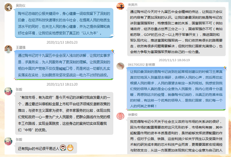 会后,0617支部成员纷纷在支部群聊中分享听课感受,“陶书记结合自己的工作体会和人生感悟予我们以言传身教,获益良多”“学习文本、用心体会,把学的内容与具体实施的举措对应起来,感觉这样的学习方式很nice!” 支部成员进一步加深了对十九届五中全会精神的理解,以及作为一名共产党员的荣誉感、责任感。