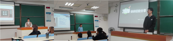 分享会吸引了同学们的积极参与,现场座无虚席。第一位进行分享的是李雨欣学姐,她从升学经验方面开始切入,向大家简述了升学所需要准备的材料,着重掌握的技能,还就如何选择导师分享了自己的一些小经验。随后,在学习方面,她着重强调了合理规划时间和上课认真听讲,她说“学习方法可能因人而异,踏踏实实才是不变的王道”。