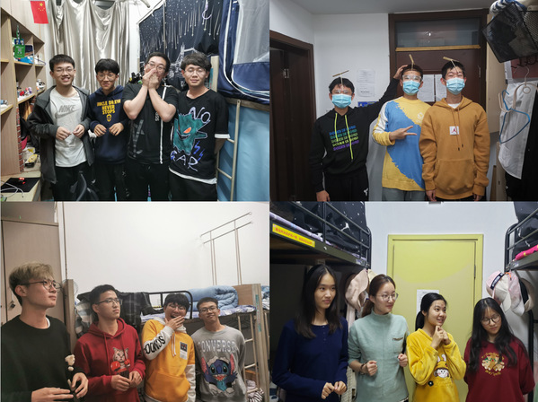 当天晚上,一张天线宝宝的合照出现在0619的通知群中,紧接着是辅导员的一条查寝通知,内容要求同学们在20分钟内模仿着四个天线宝宝的姿势在寝室里拍一张合照,并且要传神的模仿出天线宝宝的神态,这样方可证明自己按时到了宿舍。不同于以往的查寝方式在很大程度上勾起了同学们的兴趣,大家在寝室里聊得火热朝天。有的寝室商量着四个同学要穿四种不同颜色的衣服,并且要和天线宝宝保持一致;而有的寝室又商量着要在头上扎两根天线,完美还原出天线宝宝的形象。相较于平时宿舍里的安静,今天的材院宿舍多了几分热