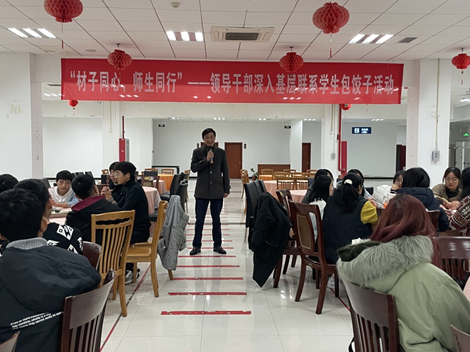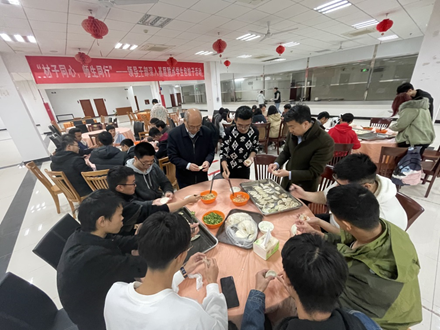 “来到南航学业和生活上还适应么”、“大家平时都喜欢到哪个食堂吃饭呢”、“经常点外卖吗?要注意饮食健康安全”、“实验进展情况和课业压力怎么样”……领导老师一边与同学们包饺子,一边与大家话家常,仔细询问了大家的学习和日常生活情况,并教导同学们要勤学习、会生活。