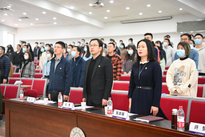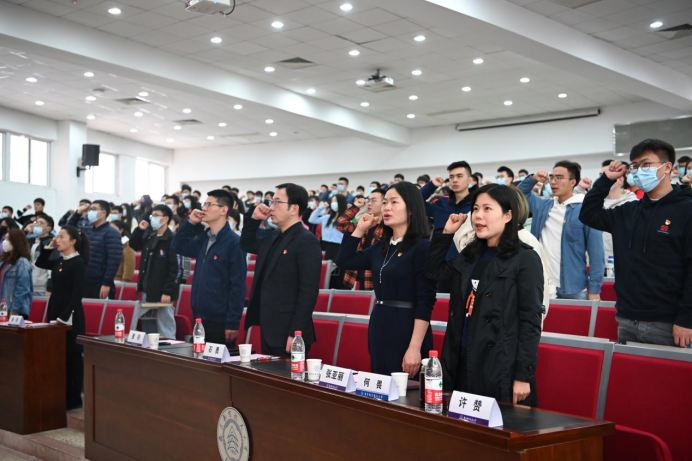 许赞带领大家一同佩戴党徽,重温入党誓词并齐唱国际歌,以庄重的仪式迎接之后的党史学习。
