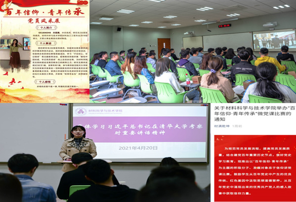 为了贯彻上级组织开展党史学习教育的工作部署,聚焦思想引领主责主业,引领全院团员青年“学党史、强信念、跟党走”,做到学史明理、学史增信、学史崇德、学史力行。学院结合实际,积极探索行之有效的党史学习教育途径。推出“百年信仰 风采传承”百名优秀学生党员风采展,学习先进,砥砺自我;及时开展“习总书记清华大学考察时的重要讲话”交流会,激励学生肩负使命,坚定信心;除此之外,学院还将在5月份开展党史故事支部接力学、“百年信仰 青年传承”微党课比赛鼓励学生从百年党史中产生的优良传统、红色基因中汲取思想道德营养,从百年党史中涌现出来的优秀共产党人的感人故事中获取信仰力量。