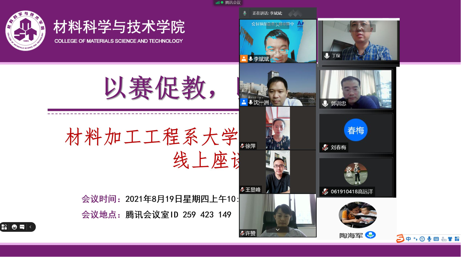 为进一步激发青年教师指导学生科创项目的积极性,提高科创指导能力,8月19日,午夜av 材料加工工程系组织开展“以赛促教,以赛促改”学生科创项目线上交流活动。校团委副书记丁琛,学院副院长陶海军、党委副书记许赞、团委书记徐萍、材料加工工程系主任郭训忠以及材料加工工程系30余名青年教师和参赛学生代表参加了此次座谈会。