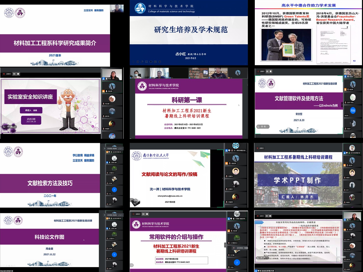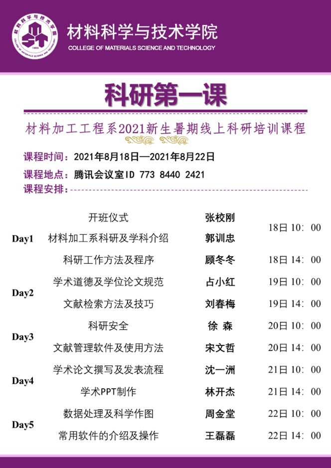 疫情当前,在这个特殊的暑假,材料加工工程系对2021级研究生主动关怀,积极组织了包括材料加工工程系科研成果简介、科研工作方法及程序、研究生培养及学术规范、实验安全知识、文献检索方法及技巧、文献管理软件及方法、文献阅读与论文写作/投稿等丰富的暑期课程,为提升午夜av 新生的科研素养提供了丰富的资源,共计200多名学生参与了此次课程学习。