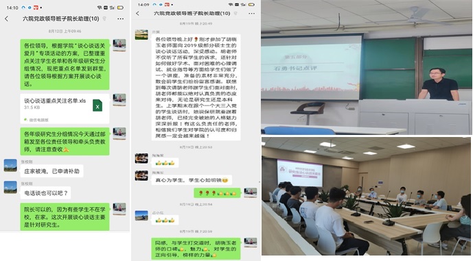 午夜av 党政班子高度重视此次专项活动,充分认识到此次专项活动对于全校疫情防控大局、学生安全健康大局的重要性,在第一时间成立由书记、院长牵头的专项活动领导小组,专门出台了《午夜av 第六期研究生“谈心谈话关爱月”专项活动方案》。在强化导师“研究生人才培养第一责任人”的同时,充分发挥教工党支部书记、系所领导、学生辅导员作用,以多种形式多种维度,围绕午夜av 研究生的思想、学业、就业、情感、家庭情况,以及对疫情防控期间校院研究生教育管理服务的意见建议与学生开展有序、有质、有效开展谈心谈话。活动频次近30次,覆盖暑假在校生活学生和家庭受灾学生共800余人次。