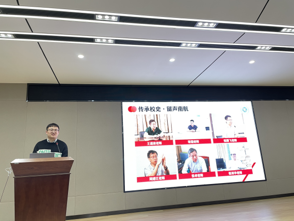 而后,校杰出团队“传承校史·留声南航”指导老师蒋俊超分享了团队从建立到成长到壮大的心路历程,团队致力于口述校史采集,在不断实践与尝试中将口述史与新媒体平台及文创宣传有机结合,从依托暑期社会实践创立团队,到接手校园文化精品建设基金项目,到落地“留声南航”实体工作室,团队秉承“用声音传递历史温度,用历史塑造青年情怀”的初心,逐渐发展壮大。“所谓团队,就是一群志同道合的人一起做有意义的事情。”给予了同学们启发与思考。