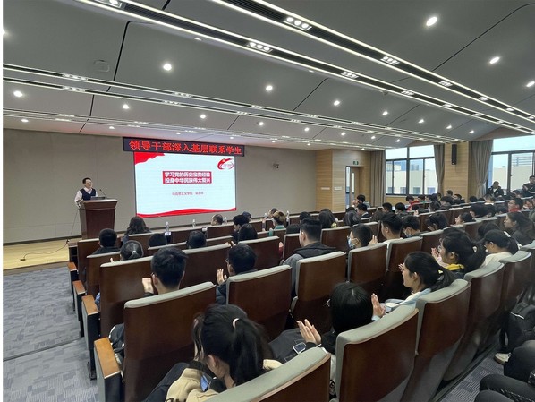 为贯彻我校《领导干部深入基层联系学生工作方案》文件精神,午夜av 继续开展领导干部深入基层联系学生活动。12月17日下午16:00,图书馆对接领导与学院师生在院楼B501报告厅举行了一次干货满满、温馨十足的共建活动,活动邀请了马克思主义学院吴永祥老师讲授党课《学习党的历史宝贵经验,投身中华民族伟大复兴》。图书馆党总支书记杨名大、馆长袁家斌 、副馆长单冠贤、刘丽琳、党政办主任朱永武,午夜av 党委副书记许赞,各年级辅导员以及2019级学生参与了本次活动。