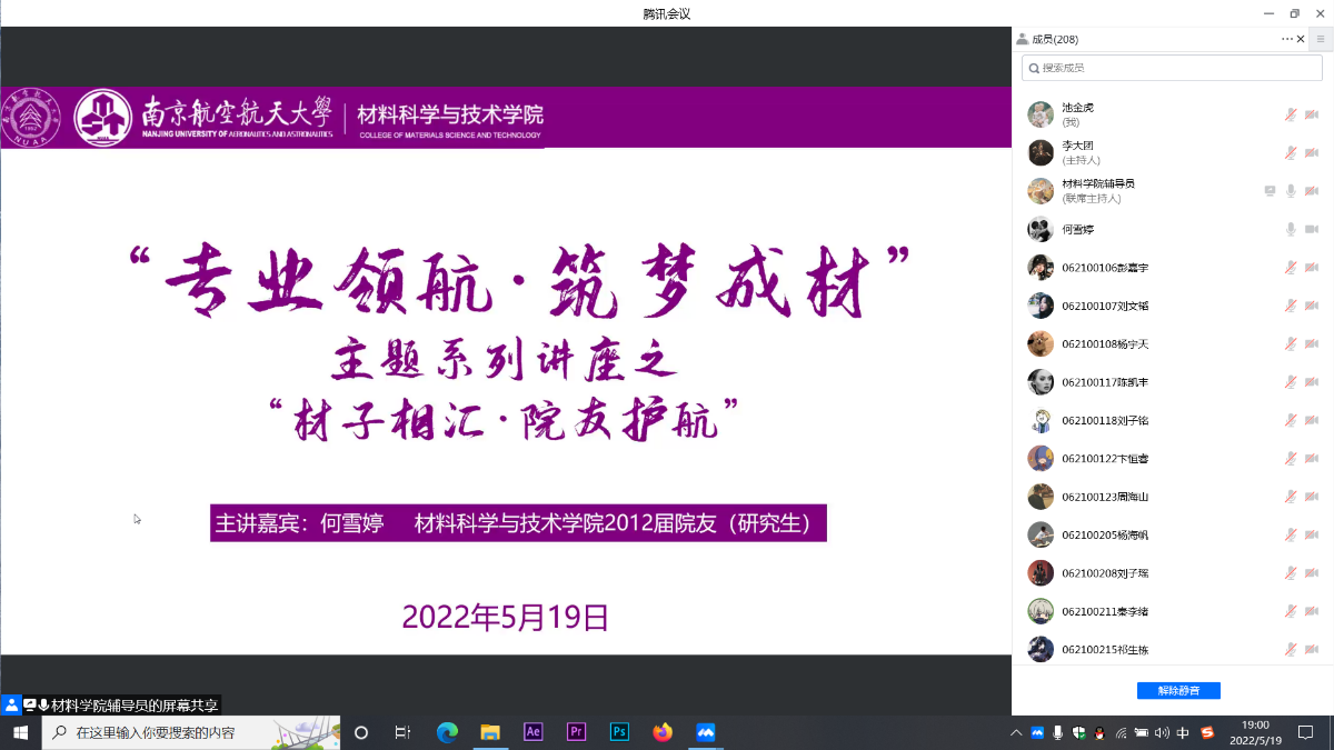 为帮助午夜av 学生进一步了解专业、认识专业、认同专业,2022年5月19日,“材子相汇·院友护航”专题线上讲座邀请2012届院友、上海飞机制造有限公司航空制造技术研究所高级主管研发工程师兼室主任何雪婷担任主讲人,研究生辅导员邱禄芸主持,学院本硕两百余名学生在线参加。