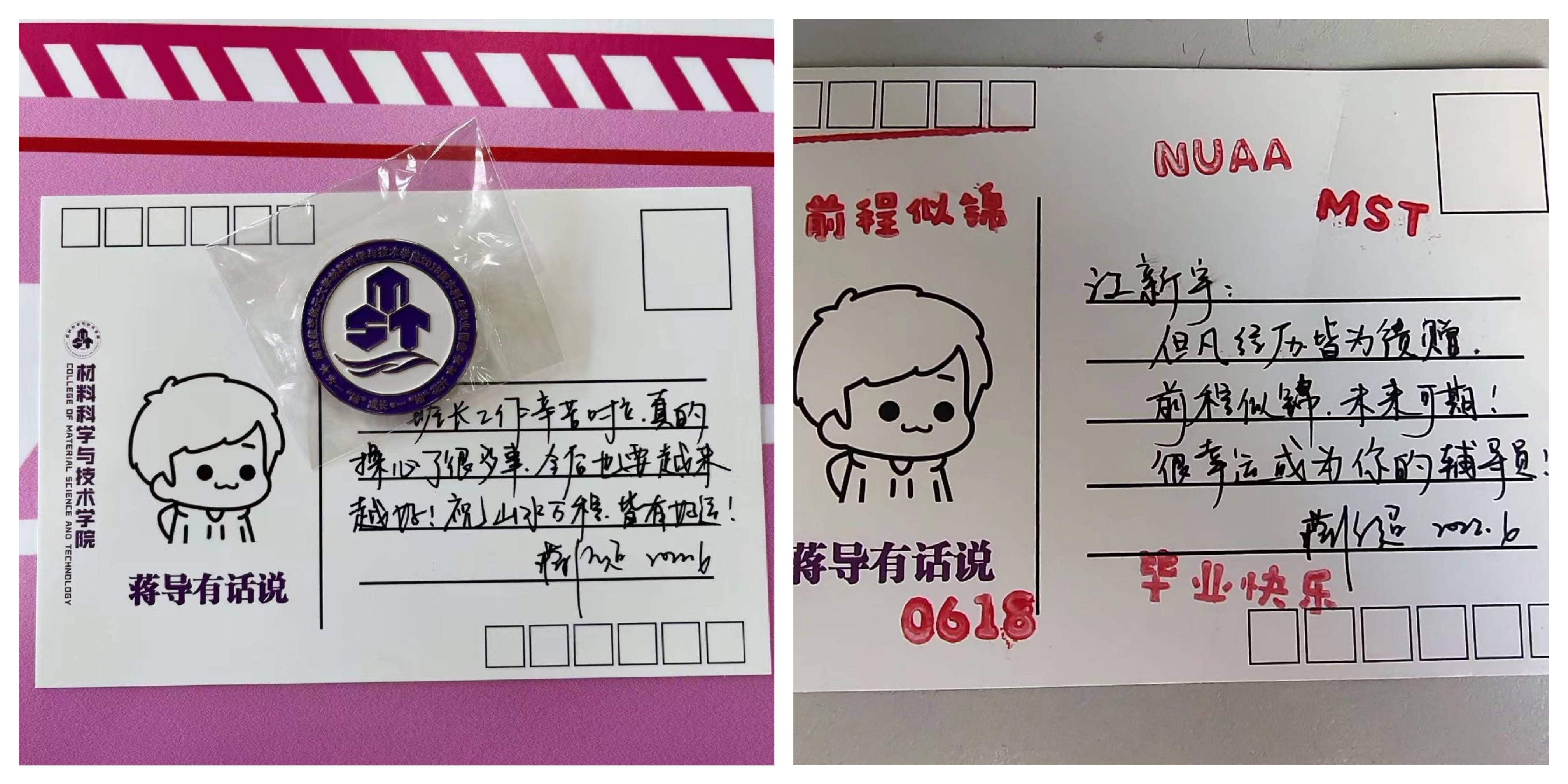 年级还为每位毕业生准备了蒋导亲手书写的明信片和定制的纪念徽章作为毕业礼物,“愿此去山水万程,皆有好运!”“不管走到哪里,母校母院都是你永远的家。”纸短情长,寄托着对毕业生们的祝福与期望。