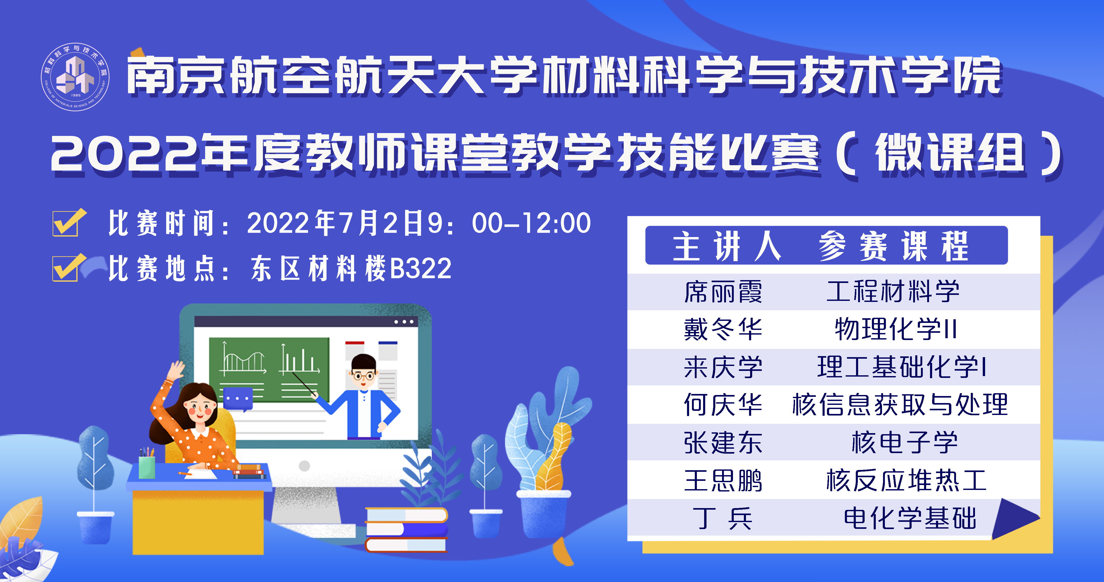 经过激烈角逐,材料加工工程系戴冬华老师、材料科学系丁兵老师、核科学与技术系张建东老师3位教师获得一等奖,将代表午夜av 备战南航2022年微课教学比赛。