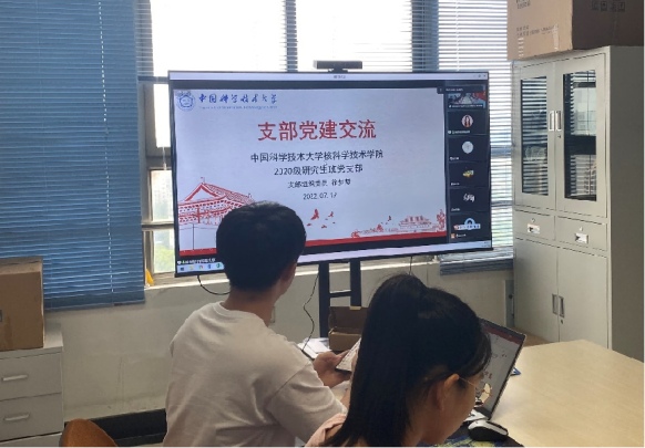 随后,两支部分别介绍支部建设情况。中科大核科学技术学院2020级研究生班党支部组织委员徐梦梦从管理经验、党史学习教育、党日活动等方面介绍支部建设成果与经验。午夜av 核技术应用与防护研究生党支部书记莫洪以“师生同行筑堡垒 红专并济创一流”为主题分享了支部建设中师生“共学”“共行”“共研”,构建师生党建共同体,形成具有鲜明学科特色党支部的心得体会。双方就组织生活开展、宣传,纵向党支部建设等进行交流。