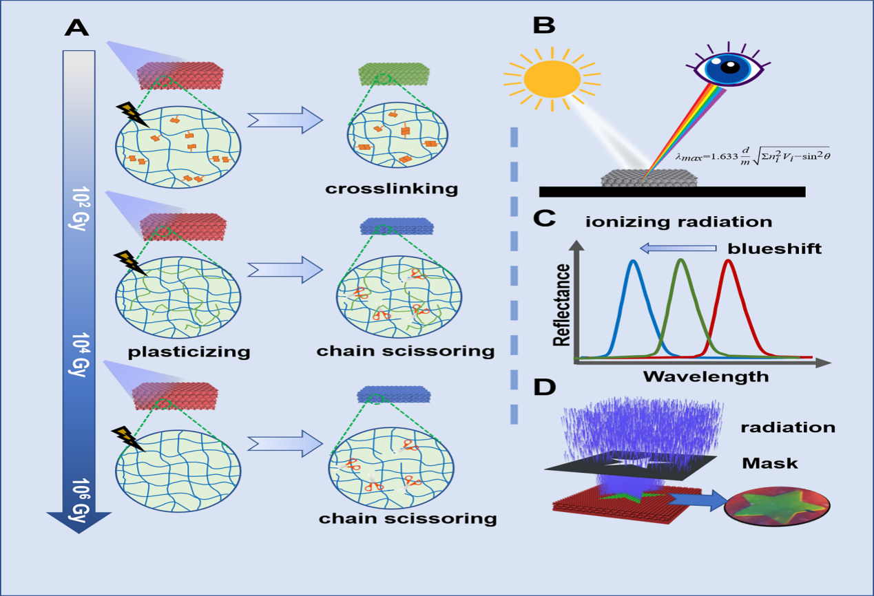 近日,午夜av 王运龙博士、马骏教授,中国科学技术大学汪谟贞副教授,苏州大学王殳凹教授等合作在Cell Press细胞出版社期刊Matter在线发表了一篇题为“Color-phase Readout Radiochromic Photonic Crystal Dosimeter”的研究论文,提出一种基于光子晶体结构色变化的全新辐射剂量计概念,并采用多种光子晶体进行了概念验证,获得了不同灵敏度的剂量计,有望应用于辐射加工、大科学装置束流校准与放射医学剂量验证等领域。该论文午夜av 博士生王志浩为第一作者, 中国科学技术大学高分子科学与工程系博士生葛志青为共同第一作者,王运龙博士为通讯作者兼共同第一作者,马骏教授与王殳凹教授为共同通讯作者。