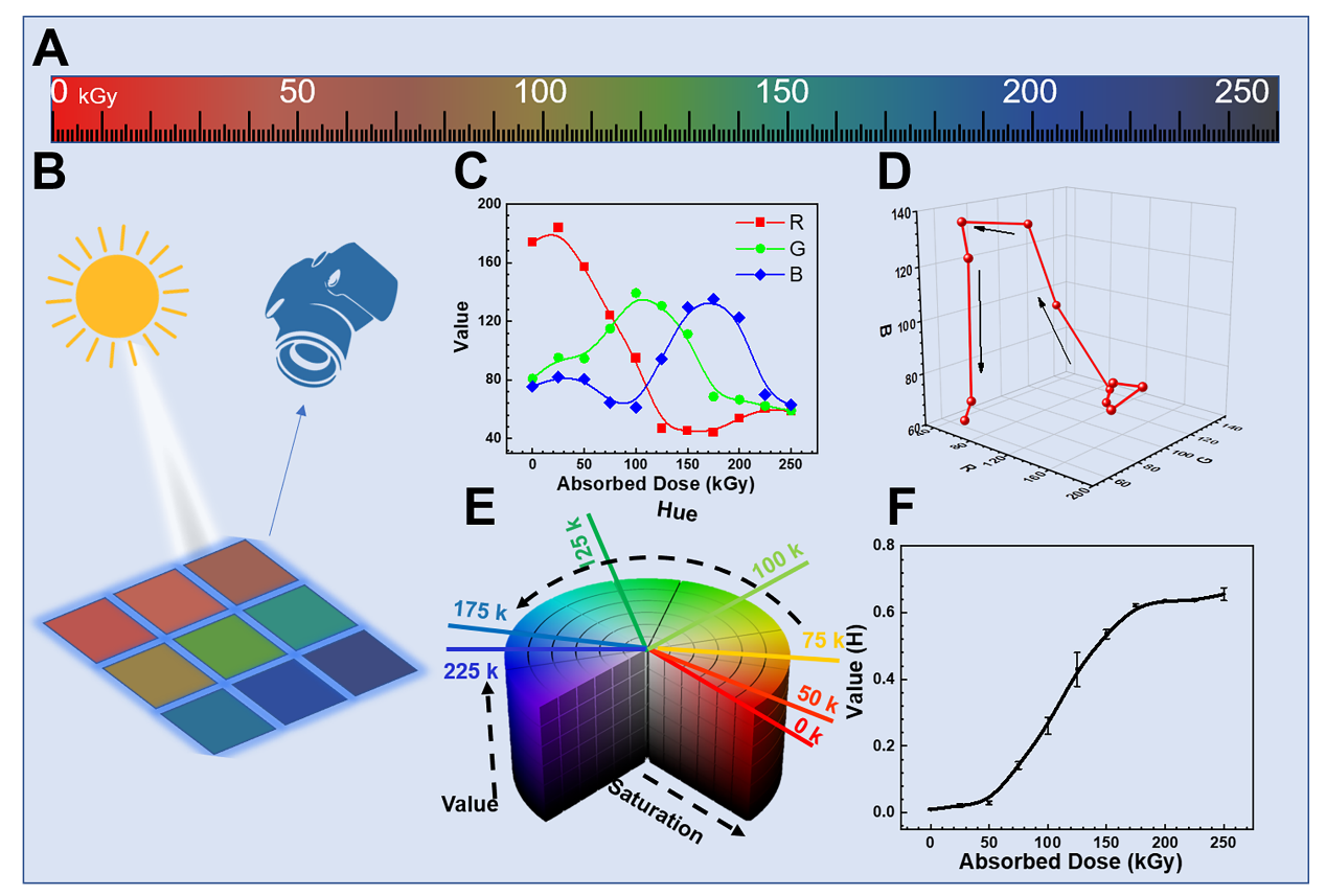 随着核技术的发展和广泛应用,辐射加工、放射医学、大科学装置束流检测、空间辐射探测等多种需求场景对辐射剂量探测提出了新的需求。辐射致变色薄膜可通过辐射后色度的变化来测定吸收辐射剂量的绝对值,因其结构简单,制备方便,成本较低,使用便捷等优势在辐射探测领域中被广泛应用。然而,这些传统的薄膜剂量计采用比色/色度法确定吸收剂量,肉眼难以直接识别,需要借助光密度计或光谱仪读取。此外,大多数辐射致变色薄膜对温度、湿度或紫外线照射敏感,需要储存在黑暗干燥的环境中。这些问题极大的限制了其在当前和未来的应用。