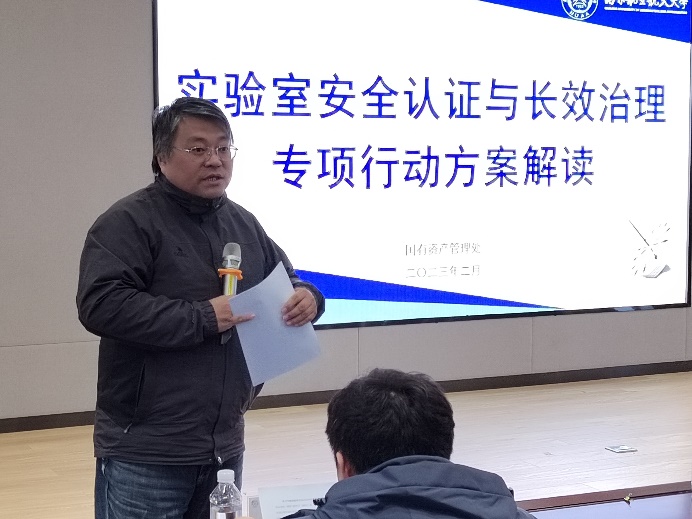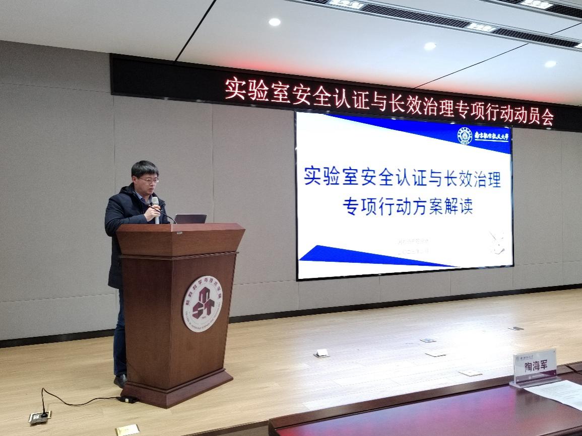 新学期、新起点、新目标、新征程,为切实增强学院实验室安全管理能力和水平,保障学院安全稳定和师生生命安全,上好实验室安全第一课,2月13日下午,在将军路校区东区材料楼B501会议室,午夜av 举办实验室安全认证与长效治理专项行动动员会,并邀请国资处阎志军副处长一行来午夜av 对专项行动方案进行解读,学院党委书记石勇,院长张校刚,副院长汤晓斌、陶海军,各系分管安全的副主任,全体实验室安全责任人参加了本次动员会,会议由汤晓斌主持。
