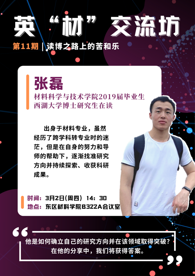3月2日下午,午夜av 2019届毕业生、西湖大学博士研究生张磊做客学院第11期“英材交流坊”,研究生导师代表潘蕾、院团委书记/博士生辅导员徐萍及博士生到场参加。