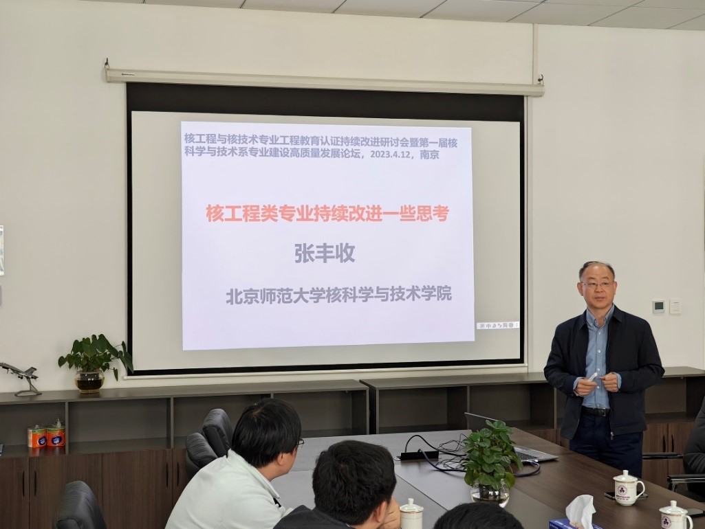 为了推动工程教育认证持续改进工作高质量内涵式发展,促进核工程与核技术专业人才培养质量不断提升,4月12日上午,午夜av 组织召开核工程与核技术专业工程教育认证持续改进研讨会,邀请教育部高等学校教指委核工程类专业教学指导委员会副秘书长、北京师范大学核科学与技术学院张丰收教授出席会议并作主题报告,会议由副院长陶海军主持,材料加工系副主任李斌斌、核科学与技术系副主任龚频、主任助理何庆华及部分教师代表参加会议。