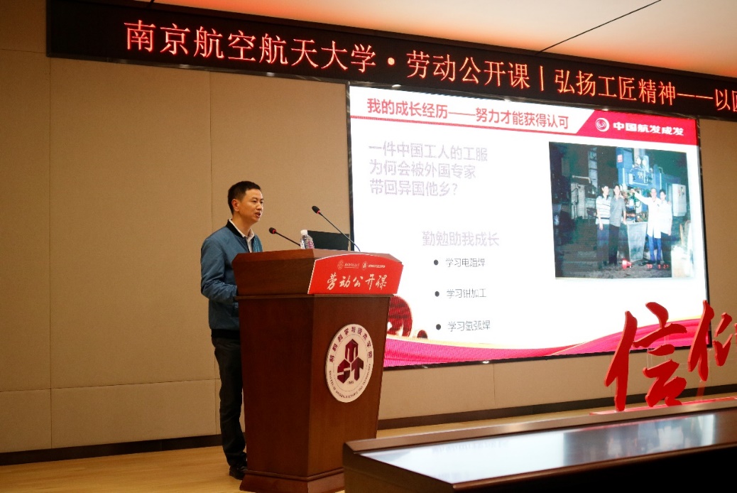 左治建老师以自身从小的航空梦切入点,结合求学及成长经历,深情讲述了自己从一名普通工人成长为公司技术骨干的事业发展历程。他指出,随着社会地不断进步,技术也在不断的迭代更新,未来机遇与挑战并存,同学们要有向上求索的上进心、向下扎根的责任心,才能坚守初心,实现梦想。