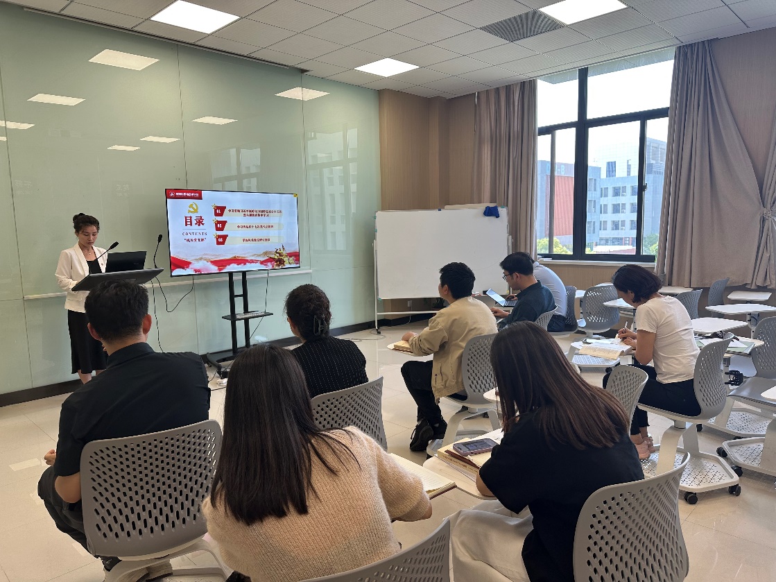 会上,彭恬以《融入新发展阶段,深学细悟勤思实干》为题给支部全体党员讲授了一堂专题党课。她表示要深刻认识开展主题教育的意义,贯彻落实主题教育各项工作安排,全面提升党员、干部政治素养和服务水平,党员同志要利用好空余时间组织学习,读原著、学原文、悟原理,做到牢记“学思想、强党性、重实践、建新功”。她强调,要努力营造共学共研的良好氛围,将交流研讨、专题辅导、实地调研等贯通起来,有机融合,进一步强化理论武装、锤炼党性修养、提升能力本领,扎扎实实开展好主题教育,围绕“学习”领题,“调研”破题,“整改”解题三个维度,切实解决广大师生“急难愁盼”问题,以优质工作推动学院发展再上新台阶。