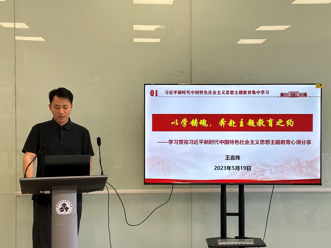 支部发展对象王嘉炜以《以学铸魂,奔赴主题教育之约》为题分享了学习贯彻习近平新时代中国特色社会主义思想主题教育心得。他表示要结合本职工作,将主题教育融入日常、抓在经常,在接下来的工作生活中,切实增强本领,不断提高自身素质,持之以恒,做一名“想干事,能干事,干成事的材料人。