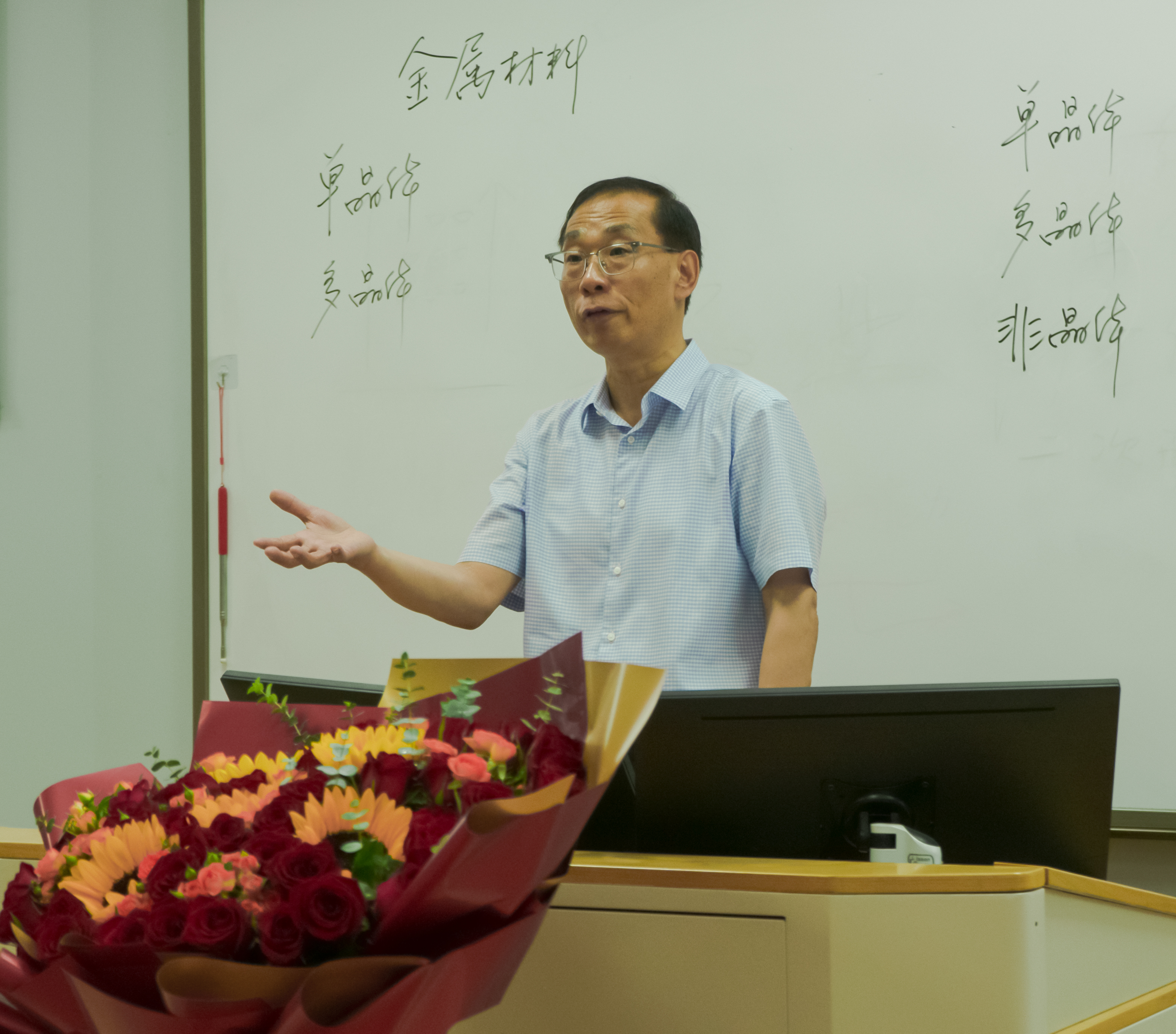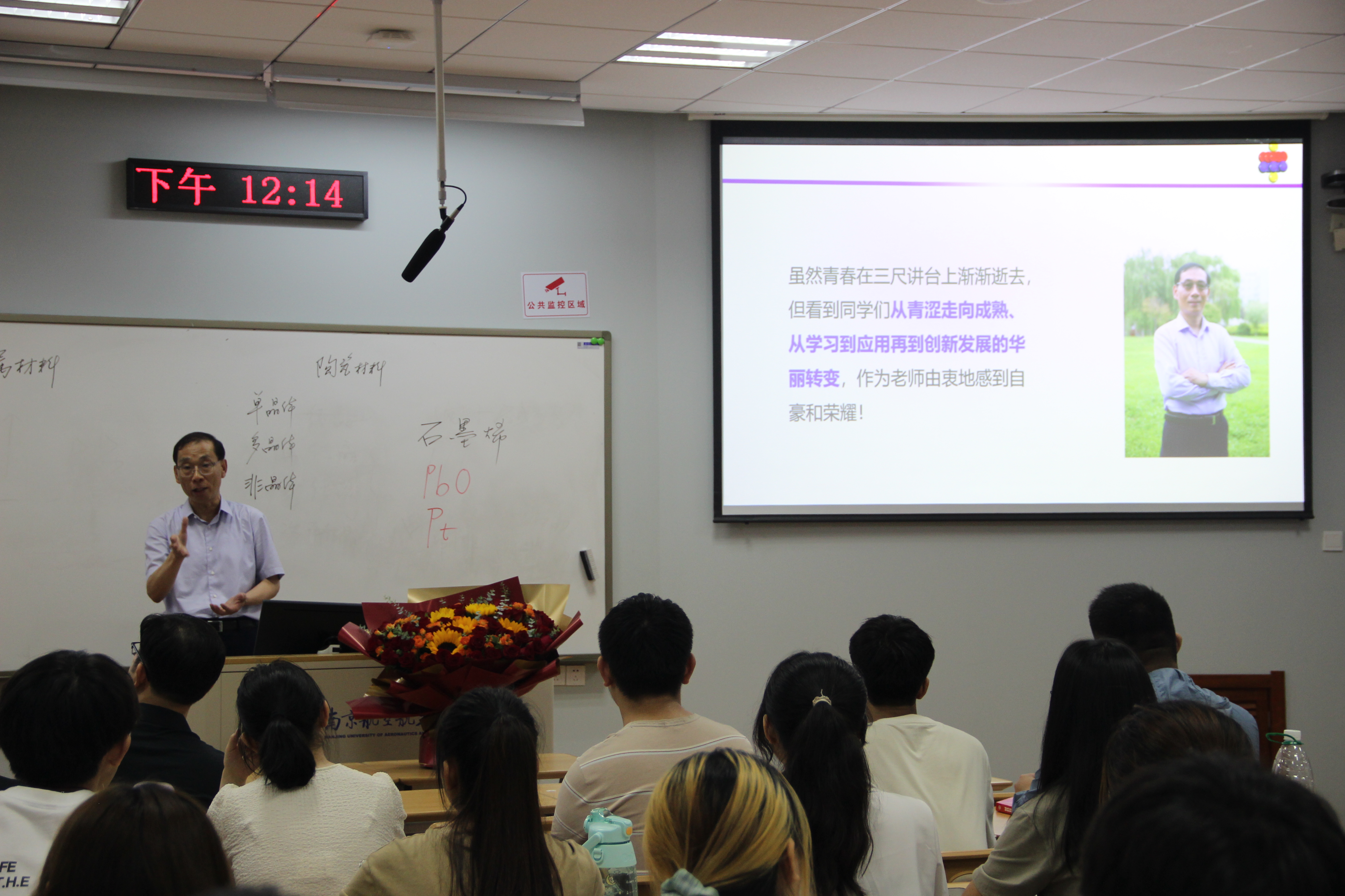 下课铃声响起,学生代表杨馥娜为陶杰教授献上鲜花,以此表达对陶老师的尊敬与不舍之情。她深有感触的说:“陶老师在学生眼里一直是一位平易近人的好老师,会关心同学们生活的方方面面。”她回忆道,在师生座谈会上陶老师认真听取每一位学生提的建议,并带领教学团队在教学过程中不断改进完善,听陶老师的《材料科学基础》课程终生受用,也让自己对专业学习坚定了信心。