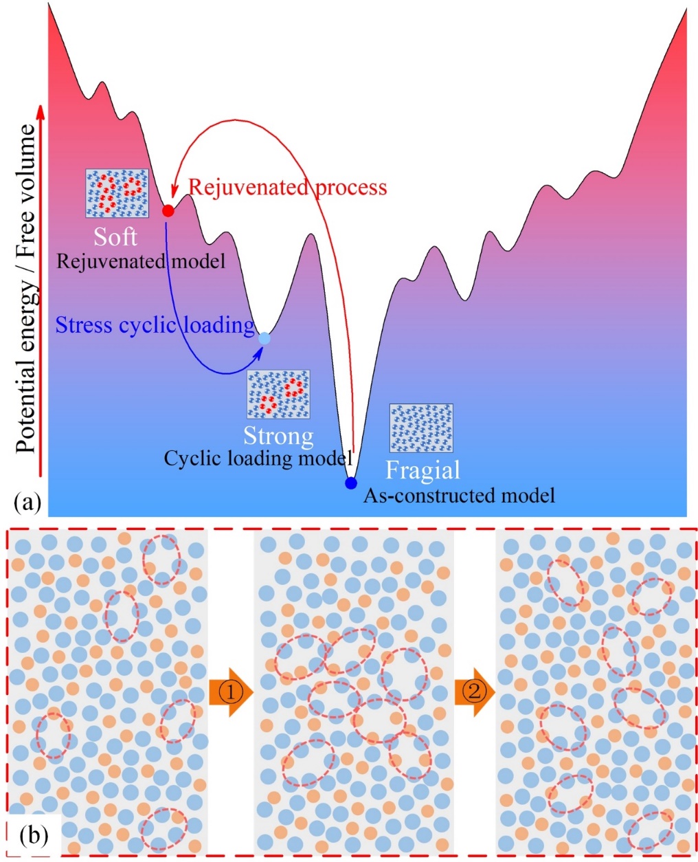 图5 (a)回春态模型和循环应力加载模型的能量变化示意图,(b)两步法调控模型中软区分布的示意图,红圈标注的区域为软区