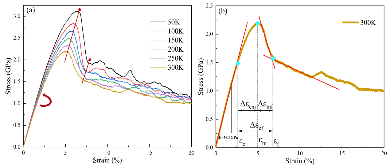 图1 (a)不同温度模型的应力应变曲线,(b)以300K模型的应力应变曲线为例定义力学参数。