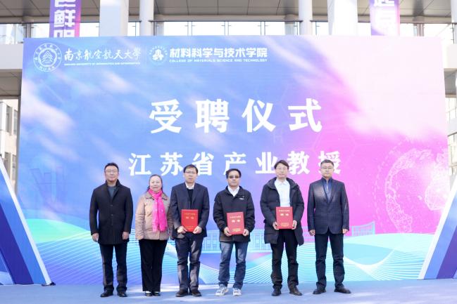 黄志球和张国共同为国家新材料测试评价平台复合材料行业中心金属基复合材料分中心揭牌。宋凯、蔡祺祥、梁文萍为何惊华、中广核集团苏州热工院主任工程师柏广海、江苏爱康科技公司总经理倪志春颁发江苏省产业教授聘书。