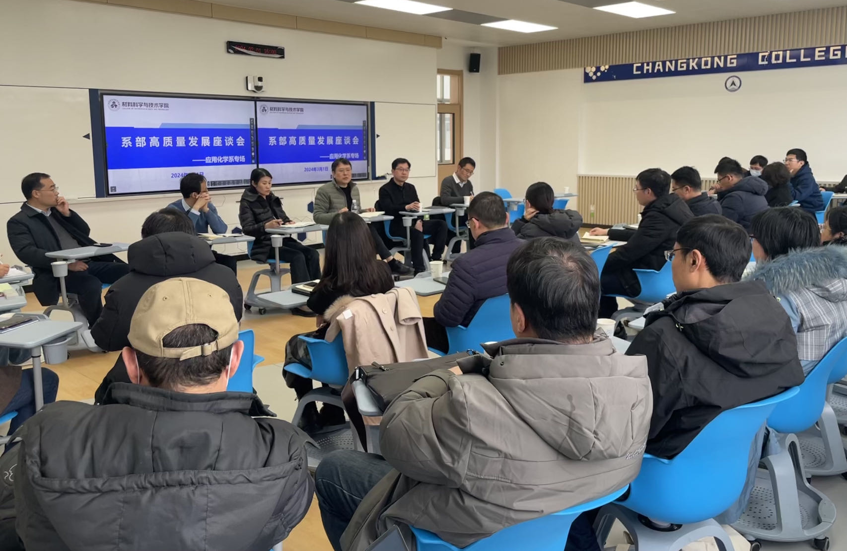 3月1日,午夜av 召开首场系部高质量发展(应用化学系专场)座谈会,锚定高质量发展,聚焦全方位提升,共谋未来发展。院领导班子及应用化学系全体教师参会,会议由党委书记石勇主持。