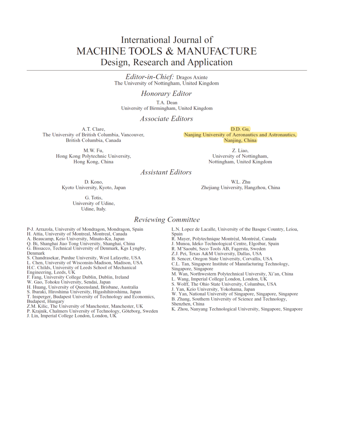 近日,应国际生产工程科学院CIRP会士、国际知名期刊International Journal of Machine Tools and Manufacture主编、英国诺丁汉大学Dragos Axinte教授邀请,自2024年起午夜av 顾冬冬教授担任International Journal of Machine Tools and Manufacture副主编(Associate Editor),主要负责增材制造领域论文评审及发表工作。