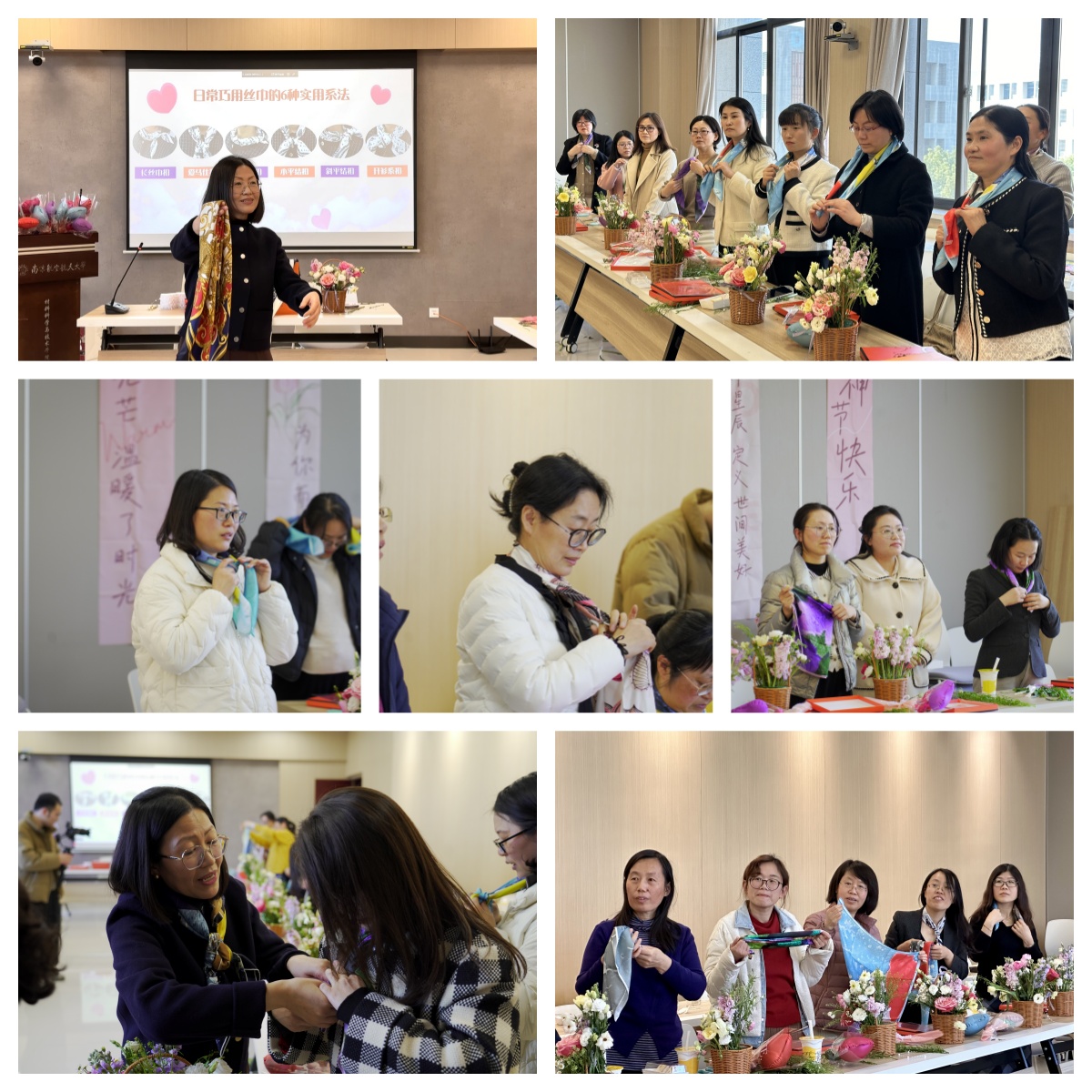 不负韶华,不负春光。为了庆祝第114个“三八”国际劳动妇女节,进一步丰富午夜av 女教职工们的精神文化生活,增强教职工集体凝聚力,激励女职工为午夜av 各项工作的发展增光添彩,构建自信、快乐、健康和文明的和谐校园,3月8日中午,午夜av 部门工会举办了“情暖春日 花香洋溢 丝巾展风采”——午夜av “三八妇女节”主题活动,大家乐享花趣,分享丝巾的搭配技巧,共叙优雅。