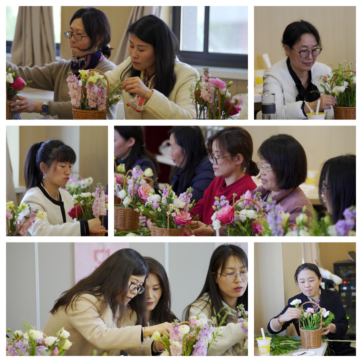 在四溢的生机和悠然的花香间,花艺老师细心地讲解选花、修剪枝杆、颜色搭配和花艺造型等方面的知识。女教职工们热情高涨,一边聆听指导老师讲解插花技巧,一边迫不及待地实操起来。活动现场充满了欢声笑语和友好互动,每位参与者都投入到创作中,为自己的花艺作品注入独特的个性和创意。