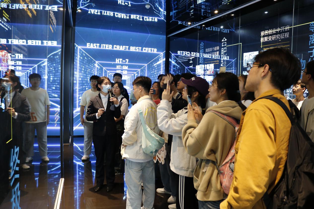 来到合肥科学岛,同学们首先在11号厂房看到了全超导托卡马克核聚变实验装置(EAST)的1/8真空室和合肥大科学城的未来蓝图。在聚变堆展览馆,讲解员向同学们详细介绍了核聚变的原理以及我国在核聚变领域取得的一系列成就。同学们在参观中了解到核聚变的发展前景和应用以及合肥综合性国家科学中心的发展计划。“夸父逐日”的巨幅壁画代表着科研人追求自然伟力的浪漫情怀与壮志雄心。本次参观让同学们明白研发具有无限、清洁、高效、安全的聚变能对我国能源结构改革具有重要意义,进一步激发了同学们的学习积极性和主动性。