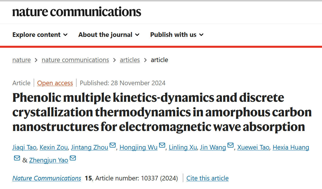 近日,午夜av 姚正军教授、周金堂副教授在《Nature Communications》期刊发表了题为“Phenolic multiple kinetics-dynamics and discrete crystallization thermodynamics in amorphous carbon nanostructures for electromagnetic wave absorption”的研究论文,博士生陶佳麒为第一作者,姚正军教授和周金堂副教授为第一单位通讯作者。