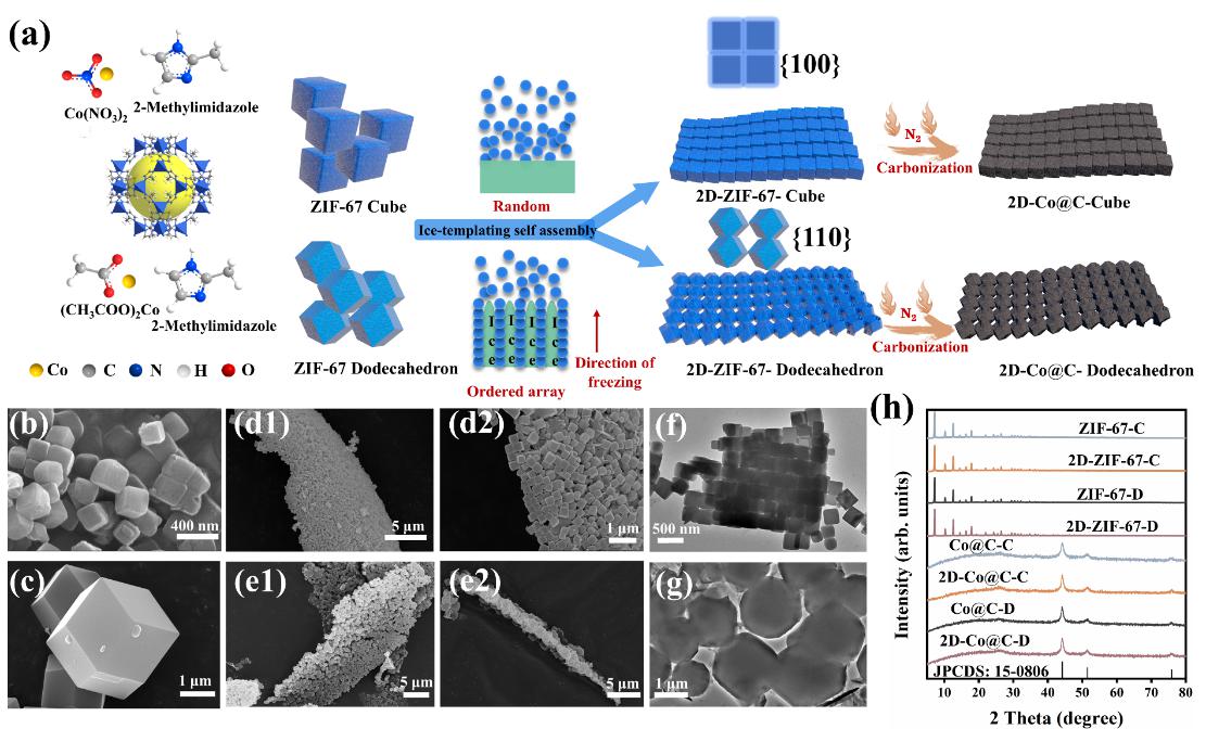通过简单的冰模板法利用固液两相间的压力差诱导纳米颗粒自组装成二维有序阵列,研究不同形貌和尺寸的ZIF衍生纳米颗粒来验证冰模板法的普适性。