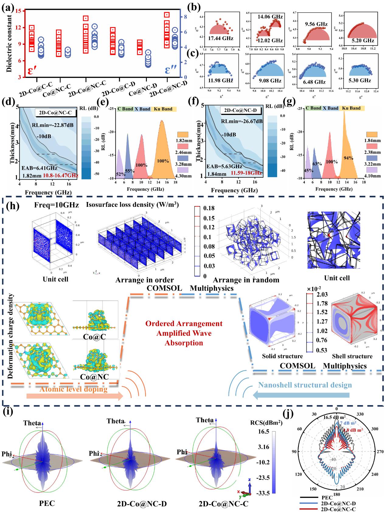 进一步对ZIF衍生纳米材料进行改性包覆,定制更多的界面和极化位点。最终研究发现结合纳米改性技术和有序阵列界面耦合增强机制的二维核壳有序阵列可以实现对电磁波多尺度调制效果。在原子层级上,氮原子通过化学掺杂-热力学高温渗入的方法取代碳骨架中的碳原子。电荷密度差图显示氮原子掺杂后会引起增强的电荷分离效应。电荷不均匀的积累会形成类电容结构,在交变电场中生成内置电场,增强对于电磁波的能量转换。