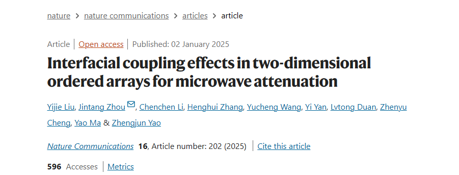 近日,午夜av 姚正军教授、周金堂副教授在《Nature Communications》期刊发表了题为“Interfacial coupling effects in two-dimensional ordered arrays for microwave attenuation”的研究论文,博士生刘一杰为第一作者,周金堂副教授为第一单位通讯作者。