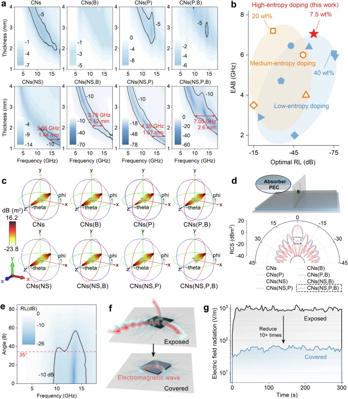 与其他代表性的低熵和中熵掺杂碳材料相比,这项工作中的高熵掺杂系统表现出宽带吸收(> 7 GHz)和高损耗(< −60 dB)的优势,且是在超低填充速率(7.5 wt%)下实现的。甚至,与最近报道的其他材料(如MXene、陶瓷基、硫属化物、聚合物基、硫化合物基和金属有机框架/层状双金属氢氧化物衍生物等)相比依然占有优势。此外,将粉体产物与弹性体结合,制备成吸波贴片,并将其应用于通信设备的芯片表面,可将辐射值从103 V/m降低至~60 V/m。
